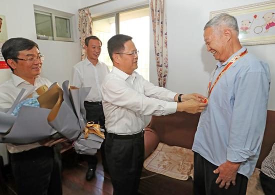 29日下午,省委副书记、市委书记郑栅洁看望慰问“庆祝中华人民共和国成立70周年”纪念章获得者,为他们戴上纪念章并送上鲜花,向他们表示祝贺、表达敬意。