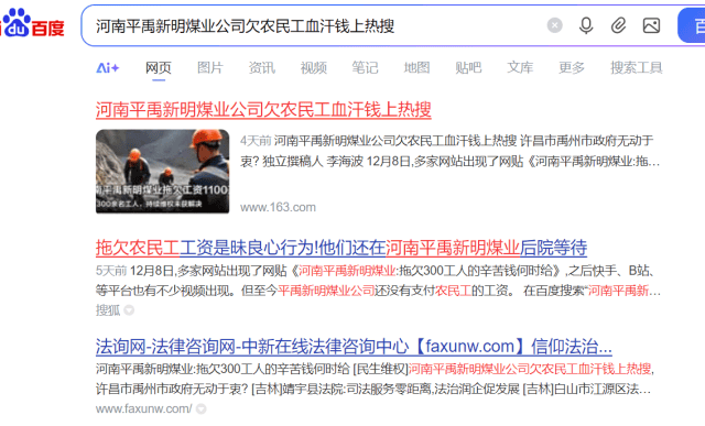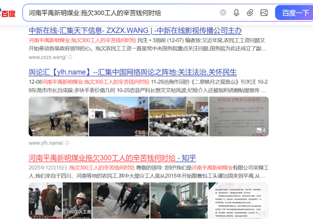 由于没人理睬,于是农民工找到法询君委托在网上发布了《河南平禹新明煤业:拖欠300工人的辛苦钱何时给》, 12月15日,撰稿人代农民工代表在河南省政务平台的“豫事办”上做了反映。 12月19日上午9:07,自称禹州市人社局的工作人员给撰稿人打来电话,说反映不实。当日下午15:32电话037412345给撰稿人来电话表明她是政务平台的,问有没有政府部门来电话,而后问人社局的答复了去现场调查没有。撰稿人联系周姓农民工代表回复是人社局在乱说,没有调查他们。