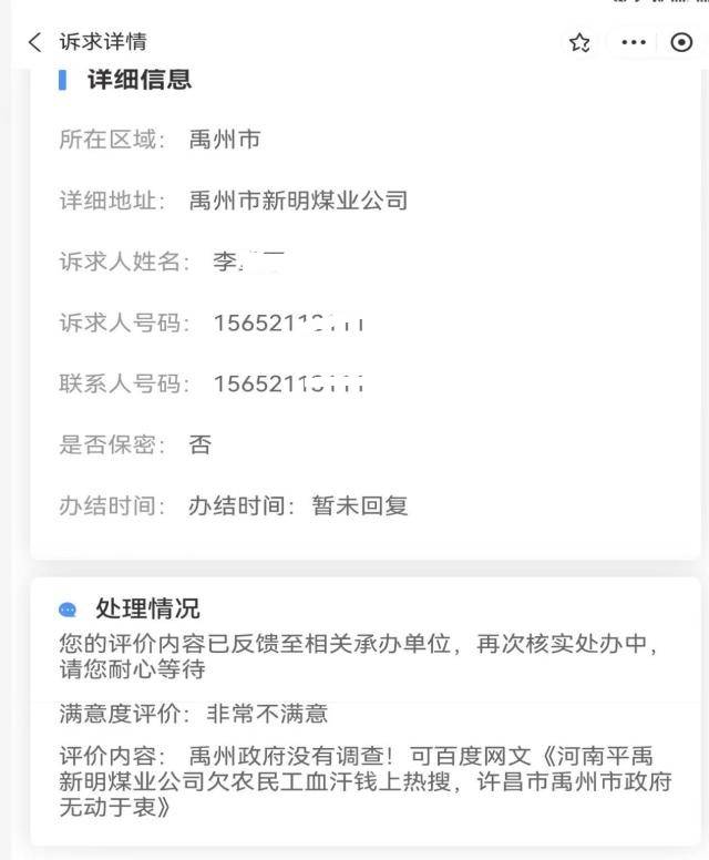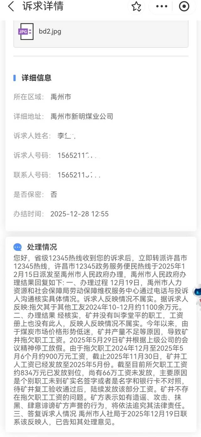 28日,撰稿人收到了“豫事办”的回复,如禹州市人社局人员来电时的如出一辙:“您好,省级12345热线收到您的诉求后,立即转派许昌市12345热线,许昌市12345政务服务便民热线于2025年12月15日派发至禹州市人民政府办理,禹州市人民政府办理结果回复如下:一、办理过程12月19日,禹州市人力资源和社会保障局劳动保障维权服务中心通过电话与投诉人沟通核实具体情况。诉求人反映情况不属实。据诉求人反映:拖欠其于其他工友2024年10-12月约1100余万元。二、办理结果经核实,矿井没有叫李堂平的职工,工资册上也没有此人,反映人反映情况不属实。今年以来,由于煤炭市场价格形势低迷,矿井产量不足等原因,导致矿井拖欠职工工资。2025年5月29日矿井根据上级公司的会议精神停工放假。由于拖欠职工2024年12月至2025年5月6个月约900万元工资,截止2025年11月30日,矿井工人工资已经发放至2025年5月份。截至目前所欠职工工资约834万元已发放到位,尚有66万工资未发放,主要原因是个别职工未到矿实名签字或者是名字和银行卡不对照,待矿井复工验收通过后,陆续发放该部分工资。矿井不存在拖欠职工工资的问题。矿方表示如有造谣、攻击、抹黑、肆意诽谤矿方声誉的行为,将依法追究其法律责任。三、答复诉求人情况禹州市人社局于2025年12月19日联系该反映人,已告知其处理意见。” 对于撰稿人对禹州市人社局和“豫事办”工作人员说的是帮农民工反映情况,竟然还是如此回复,真是令人相当无语啊!